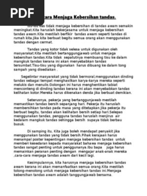 0 avaliações0% consideraram este documento útil (0 voto). Ayo jaga kebersihan, karena sebagian dari iman itu adalah kebersihan. Kebersihan lingkungan harus selalu dijaga agar kita, keluarga, dan masyarakat sekitar dapat terhindar dari berbagai penyakit. Menjaga kebersihan diri bukanlah hal yang sulit. Menjaga kebersihan lingkungan sekitar adalah suatu kewajiban bagi setiap individu.