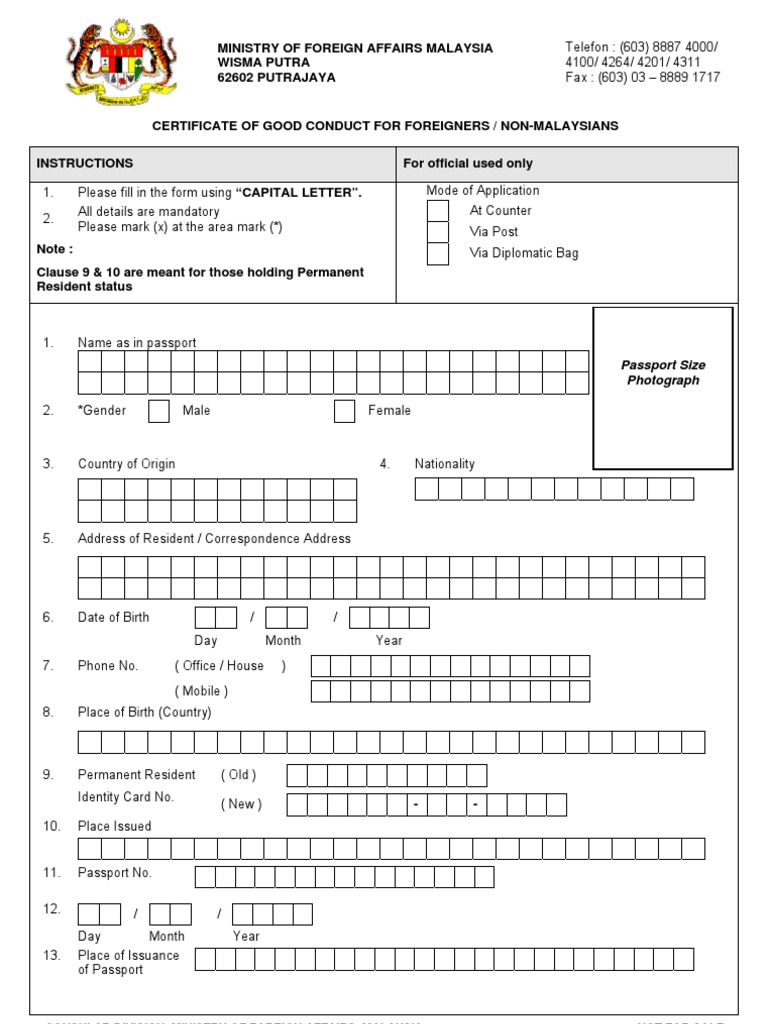 A good agent will even help you with the final steps of settling in malaysia once your application is complete. Police department or security agencies from applicant's country of origin or domicile country; Certificate (letter) of good conduct (aka police certificate) is no longer issued immediately (same day) based on statutory declaration. It's purpose is to show that you have been an upstanding citizen and have not gotten into any trouble recently. But in my case i collect it at malaysia embassy in seoul, i will need to bring 3 documents to malaysia embassy in seoul, submit these documents.