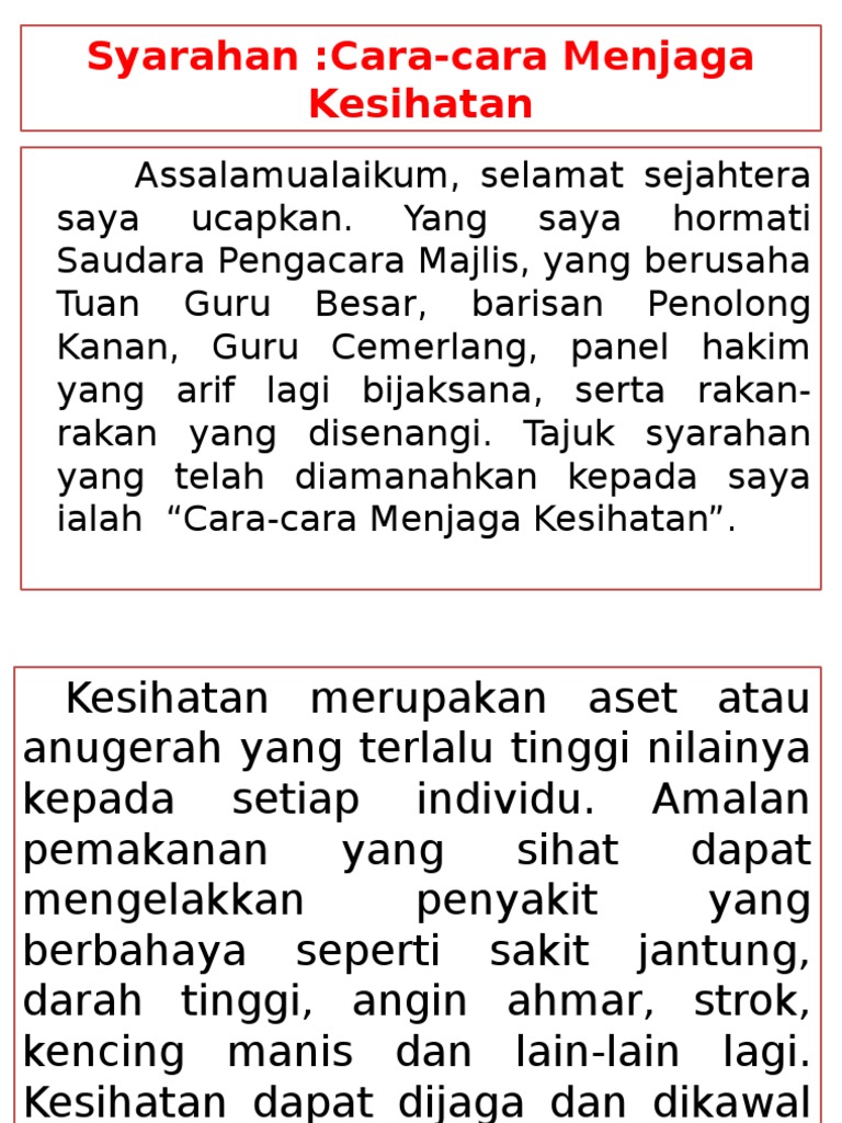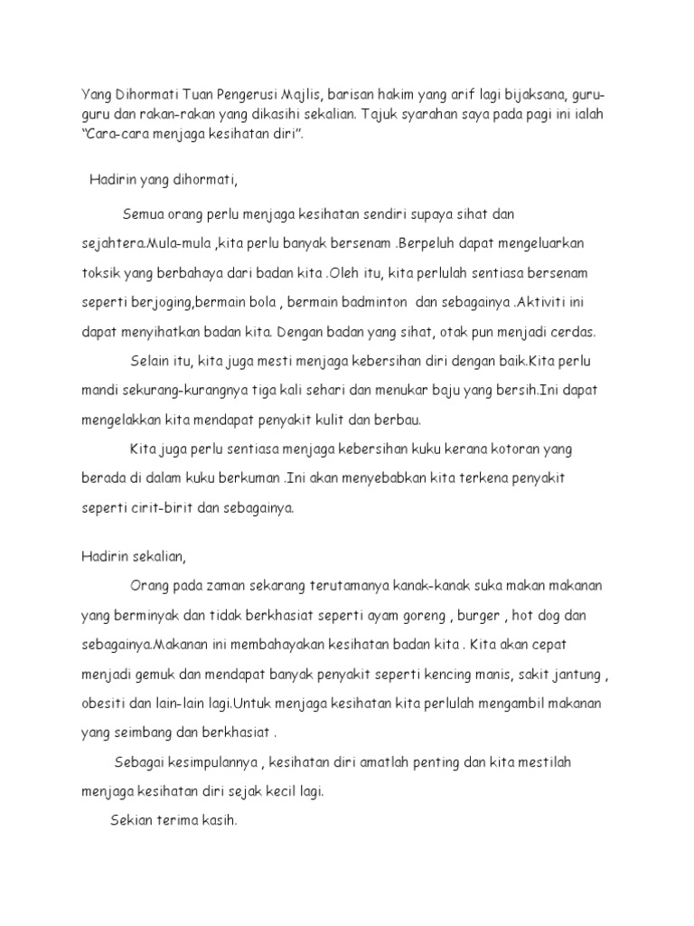 Panjang ulasan kamu hendaklah antara 50 hingga 80 patah perkataan. Kebersihan diri amat penting dalam oleh itu, kita mestilah menjaga kebersihan diri. Cara menjaga kesihatan diri dari penyakit. Antara cara bagi memastikan kesihatan diri berada dalam keadaan baik adalah dengan melakukan aktiviti riadah. Tubuh badan adalah anugerah dan amanah allah kebersihan diri adalah kebersihan tubuh badan yang perlu dipelihara sebaiknya oleh setiap individu untuk menjamin kesihatan dan kesejahteraan hidup. Murid dapat menyenaraikan idea utama dan idea sampingan untuk menghasilkan sebuah karangan yang lengkap. Calon wajib menduduki semua kertas peperiksaan bagi mata pelajaran yang didaftar. Ada banyak cara untuk menjaga kesihatan diri. Cara termudah untuk berolahraga secara konsisten adalah dengan bergabung di pusat kebugaran; Kalau tidak mau merasakan sakit, kenapa harus bunuh diri? Kesihatan dianggap perkara yang paling penting dalam kehidupan seseorang. Penjagaan kesihatan diri sangat penting dalam kehidupan seseorang. Ada banyak cara untuk menjaga kesihatan diri.