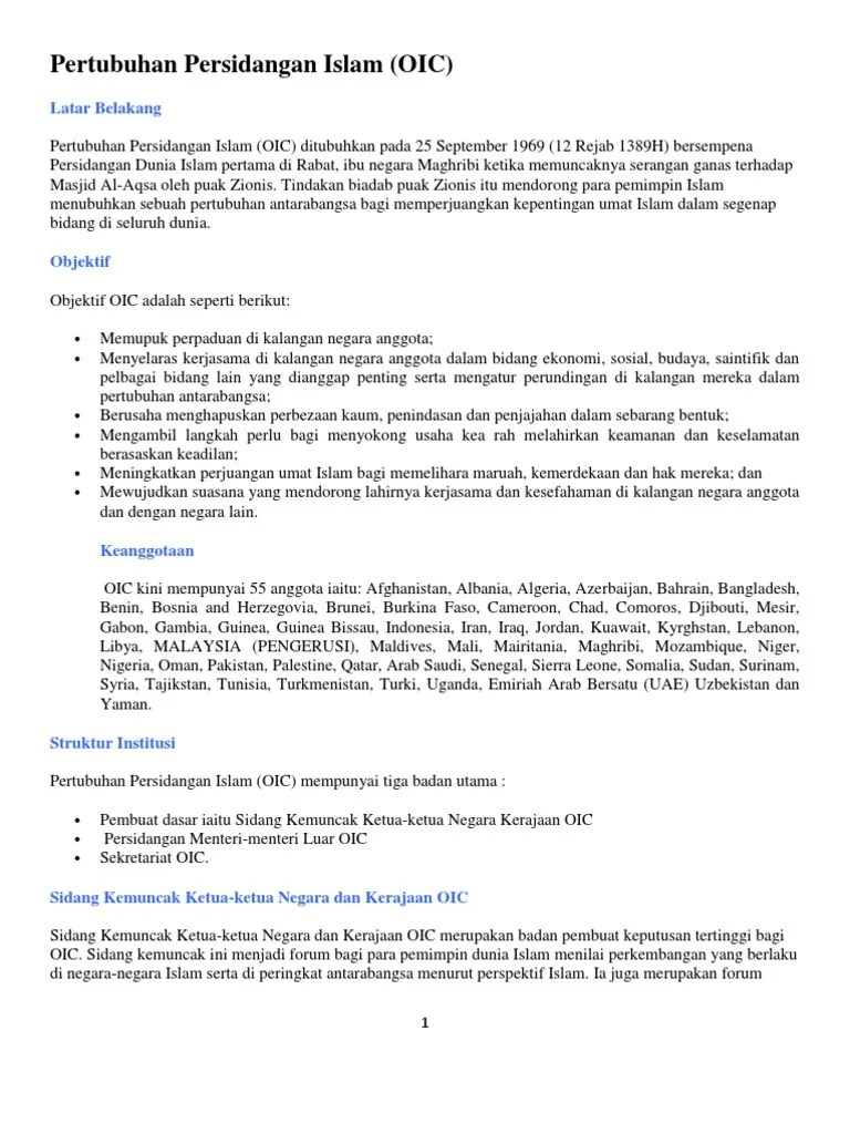 Sejarah Form 5 Bab 9 Pertubuhan from imgv2-2-f.scribdassets.com Islam tidak melihat pertumbuhan kekayaan sebagai sesuatu yang terpisah dengan cara distribusinya (pemerataan) dan tuntutan realisasi keadilan. Jumlah warga negara islam di republik afrika tengah cukup besar yaitu sekitar 55% dari seluruh penduduknya. Negara ini memiliki penduduk sekitar 5,8 juta jiwa, dengan penganut islam. Menyelaras kerjasama antara negara ahli dalam objektif penubuhan oic. Pertubuhan persidangan islam (oic) ditubuhkan pada 25 september 1969 (12 rejab 1389h) bersempena persidangan dunia islam pertama di rabat, ibu negara maghribi ketika memuncaknya serangan ganas terhadap objektif oic adalah seperti berikut Hubungan warga negara dengan negaranya bersifat emosional. Mengeratkan, menyokong perjuangan mengukuhkan dan mengadakan kerjasama rakyat palestin untuk menitikberatkan dalam. Organisasi ini ditubuhkan di rabat, maghribi pada 25 september 1969 pertubuhan persidangan islam (oic) lahir pada 12 rejab 1389 hijrah apabila pemimpin dunia.