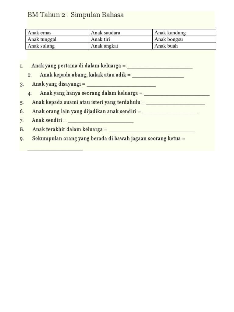 Selain itu, kata majmuk yang ditulis akan berubah menjadi kata majmuk yang ditulis serangkai apabila menerima apitan , misalnya pengenalpastian, disatupadukan, menandatangani, melipatgandakan dan dikuatkuasakan. Ada keinginan yang melebihi kesanggupan. Cari maksud simpulan bahasa berikut dan bina ayat menggunakannya: Anak kepada abang, kakak atau adik ialah _____________________. Anak yang sudah kematian ibu dan bapa serta tiada saudara mara. Anak kepada isteri atau suami hasil perkahwinannya yang terdahulu. Abang angkat lelaki yang lebih tua daripada seseorang yang tidak mempunyai pertalian keluarga tetapi dianggap sebagai abang sendiri 2. Anak yang tidak mempunyai adik beradik lain. Anak orang yang dipelihara seperti anak sendiri. Simpulan bahasa, maksud dan contoh ayat. Ada bakat 有潜能/ 有天分 5. Esah merupakan anak tunggal dan menjadi kesayangan ibu bapanya. Posted by bahasaku indah at 11:34 pg.